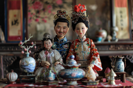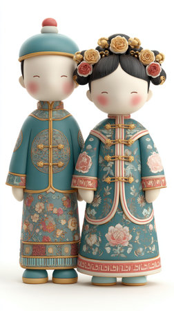 Elegant dolls in ancient chinese attire with intricate details, displaying cultural heritage