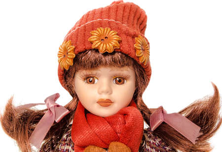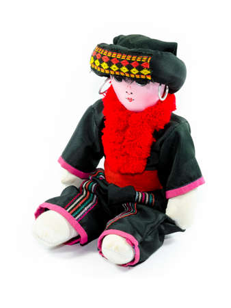 Elegant close-up of a doll in vibrant cultural attire, isolated with copy space.