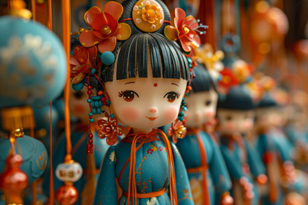 Colorful traditional dolls displayed in a vibrant market, showcasing intricate craftsmanship and cultural significance