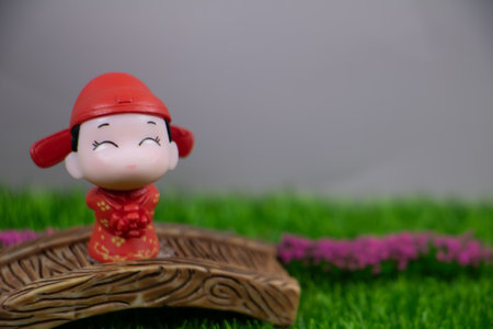 Cute boy figurine in a red traditional outfit smiling on a wooden bridge with green grass and copy space, expressing happiness and cultural warmth.