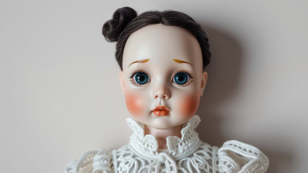 Porcelain doll with dark hair and intricate lace dress against light background.