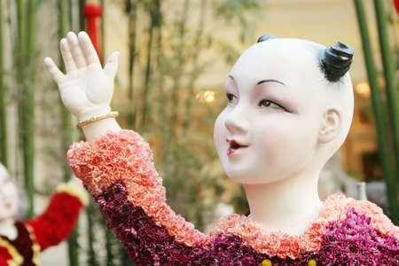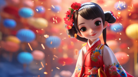 A woman in a traditional Chinese dress on the background of fireworks is preparing to welcome guests. The concept of the Chinese New Year. A doll in a national costume.