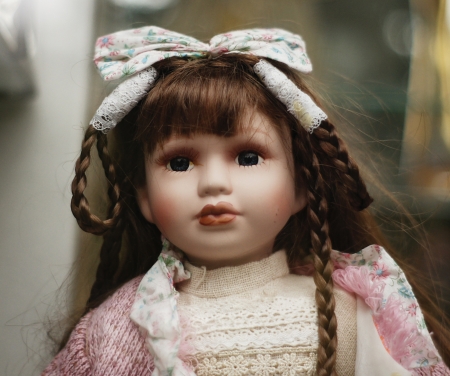 Vintage Porcelain Doll With Brown Hair and Blue Eyes in Indoor Setting.