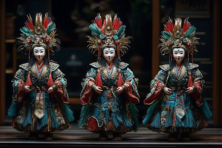 Three ornate dolls in elaborate teal and red costumes and headdresses stand in a row against a dark background