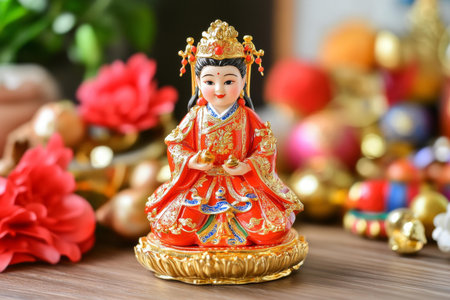 Small figure depicting Chinese goddess in traditional attire, intricate details, serene expression, cultural art.