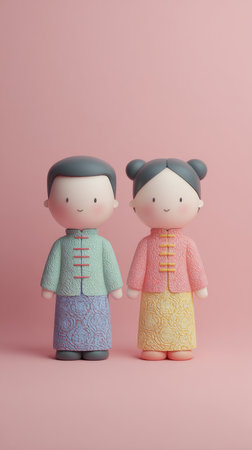 Two adorable Chinese dolls dressed in traditional clothing, set against a soft pink backdrop.