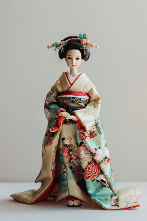 Elegant Japanese doll in traditional kimono and floral hairpiece.