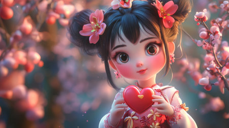 A charming young girl holds a heart in her hand, surrounded by delicate cherry blossoms. This enchanting scene evokes feelings of love and innocence, perfect for spring themes.