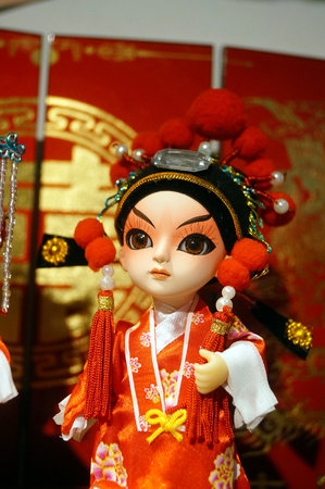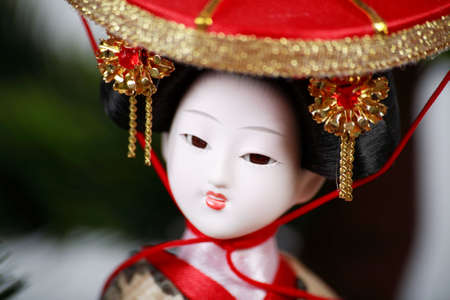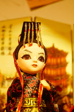 Asian doll in traditional dress with conical hat, bokeh background, copy space.