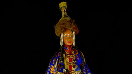 Close-up portrait of a Mongolian-style doll in intricate attire, with copy space.
