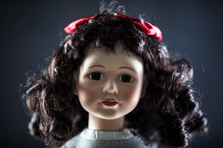 Face of cover kid girl 9-10 year old in doll image in black at dark textured wall, frozen eyes pose looking away. Pretty child with long hair isolated in shadow. Performing concept. Copy ad text space