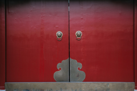 Ancient chinese red wooden door with dragon golden carve gate of chinese temple