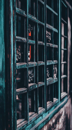 Dark Teal Vintage Wooden Window Pane Lattice Asian Design old art grid home blue frame house decor