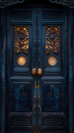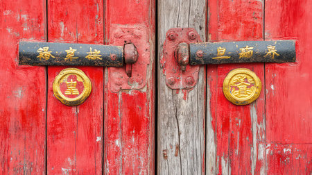 Mesmerizing close-up of vintage red doors featuring golden decorations, showcasing intricate details and rustic texture, perfect for traditional architecture themes.