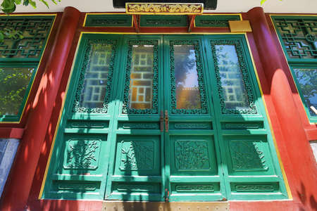 Traditional wooden door in a Chinese temple, closeup of photo.