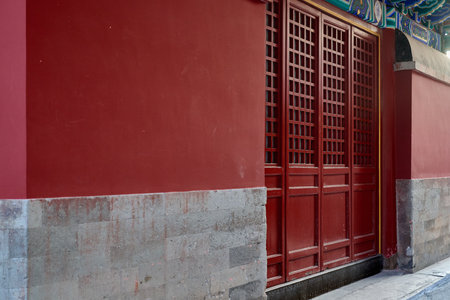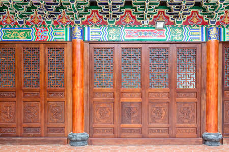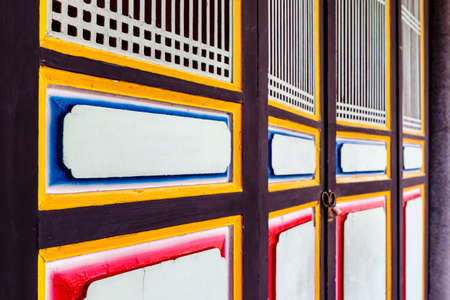 Red wooden window and door, decoration colorful painting beam and wood pole from ancient china palace in forbidden City, Beijing, China