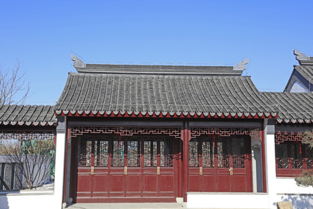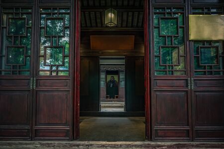 Red chinese door at Garden of Cultivation(Yi Pu) built on 1541 at Suzhou,Jiangsu,China.Which is registered in UNESCO World Heritage with classical gardens.