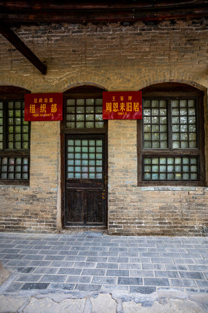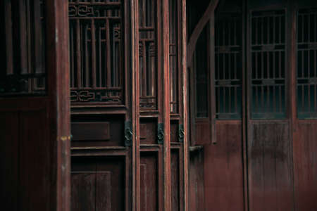 Detail of old Chinese style building facade with wooden door and windows in a town.This is architectural style in the begin of last century's.
