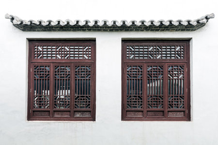 Solid wood lattice windows on white wall of ancient Chinese style house