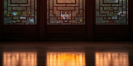 A cinematic wide environmental shot (16:9) featuring a traditional Chinese geometric wooden window l