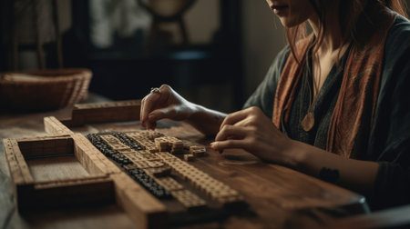 Group of People Engaging in a Strategic Game of Mahjong with Colorful Tiles on Wooden Table, Focus on Hands and Mahjong Pieces AI Generative