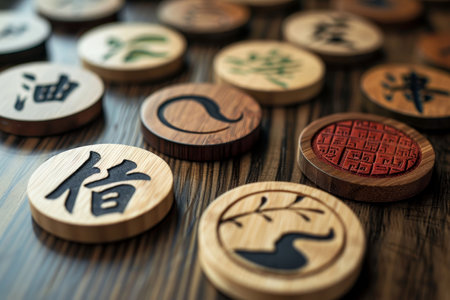 Close-up view of multiple buttons scattered on a table, showcasing different shapes and colors, A modern interpretation of traditional Chinese herbal medicine symbols
