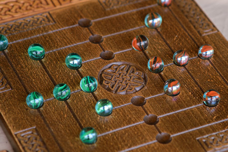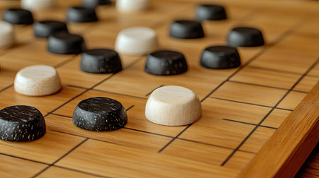 This close-up image showcases a traditional board game featuring strategically arranged black and white pieces. The wooden board adds a warm touch, perfect for game nights.