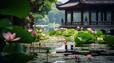 peaceful pagoda garden with water features, elegant greenery, and artwork, created with generative ai