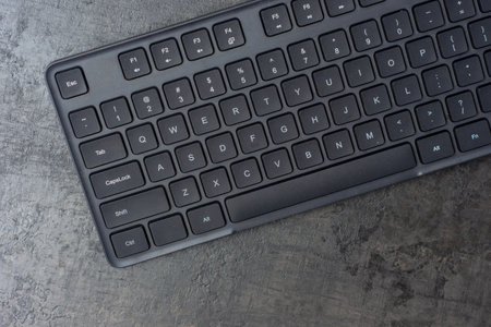 Black wireless computer keyboard on a dark concrete table
