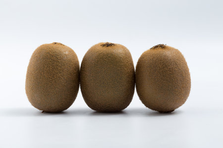 Whole ripe kiwi fruits with one sliced piece revealing the fresh green inside. Great for healthy lifestyle visuals, nutrition themes, organic food and supermarket advertising.