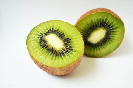 Sliced kiwis arranged on a white surface, showcasing their vibrant green color and black seeds