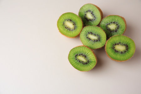 Halves of fresh kiwis on beige background, flat lay. Space for text