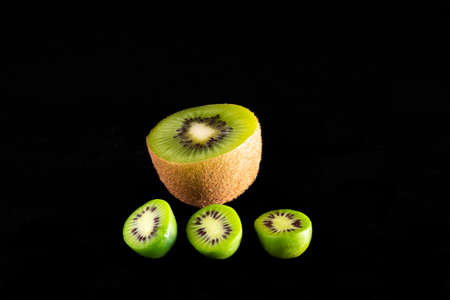 Kiwi fruit close up. Kiwis of different varieties, Green Kiwi and Baby Kiwi on black background