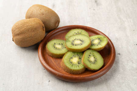 Fresh kiwi fruits served in bamboo tray on wooden background, selected focus image, close up.