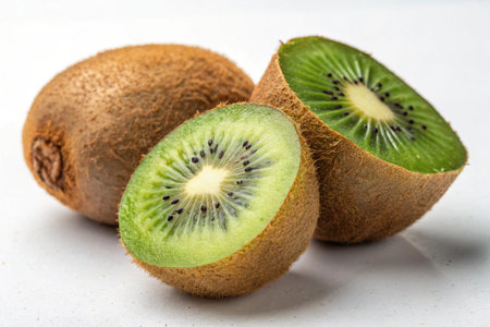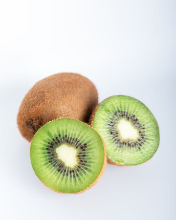 Ripe whole kiwi fruit and half kiwi fruit isolated on white background. Close-up, copy space, selective focus, Mock up