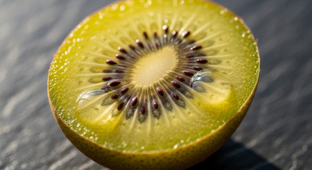A unique blend of nature and technology shows a sliced kiwi fruit with circuit patterns. The fresh green inside highlights seeds, creating an eye-catching visual contrast.