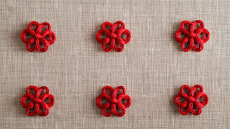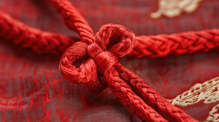 This image features a stunning red decorative knot, highlighting intricate craftsmanship and cultural significance in textile design. The symmetrical pattern showcases artistry and creativity in handmade cord work, making it a versatile decorative element.
