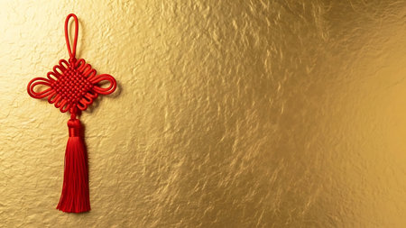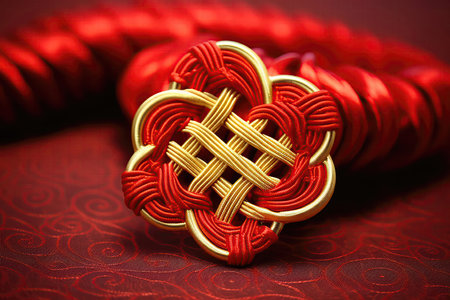 Hero detail shot of a magnificent red and gold Chinese knot, symbolizing endless prosperity. The tex