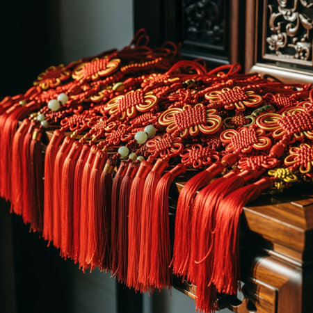 A close-up of intricate Chinese knot decorations hanging against a festive red backdrop, symbolizing prosperity and good fortune.