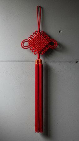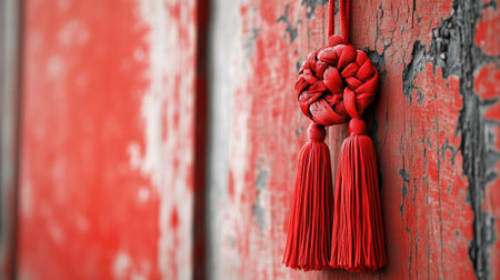 A close-up of a decorative red knot hanging on a wall, symbolizing good fortune and happiness for the Lunar New Year