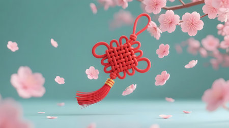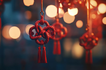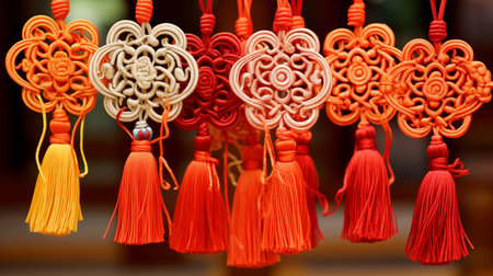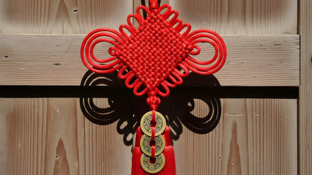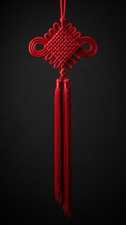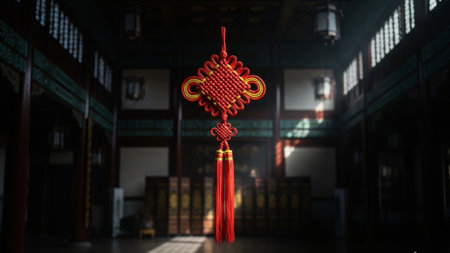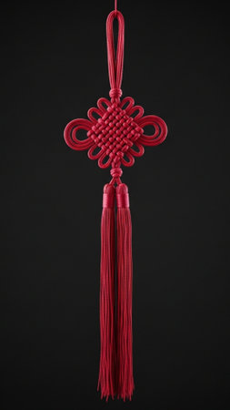 A traditional chinese knot decoration hanging against red background, symbolizing good luck and prosperity. intricate design and vibrant color evoke sense of cultural richness and celebration