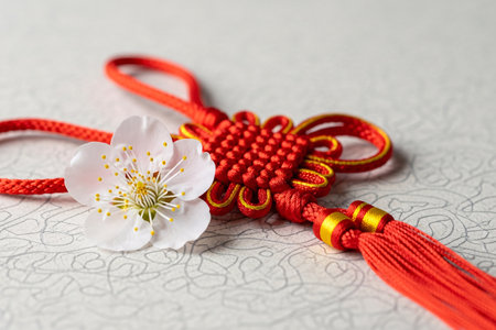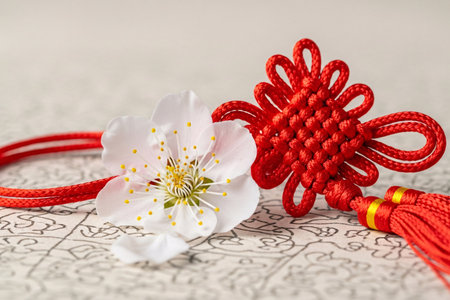 Traditional lucky knot symbol with Meihua petals rests on the detailed surface of classic oriental paper.