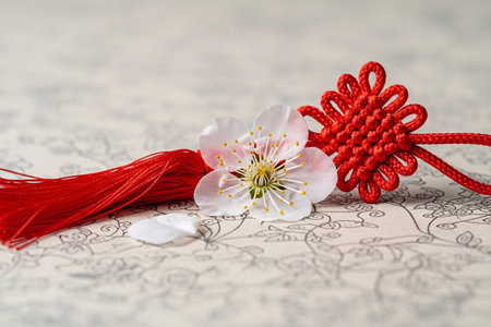 Oriental cultural art still life knot and flower are symbolic decorations for the seasonal celebration.