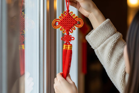 Ornamental knot and tassel being hung by hands a vibrant cultural tradition of Eastern decorating for the seasonal family celebration.