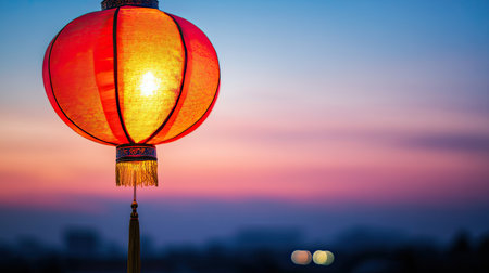 A striking red lantern hangs elegantly against a captivating sunset sky, creating a beautiful atmosphere. Perfect for cultural and festive themes.