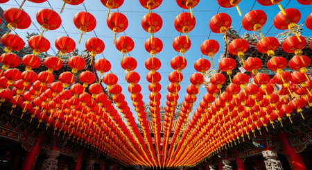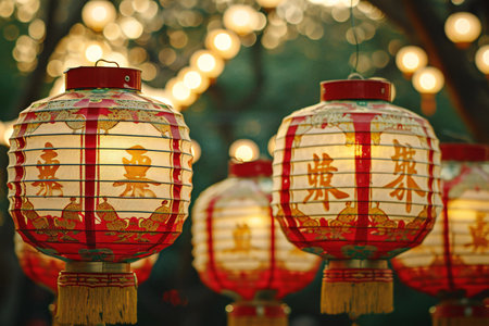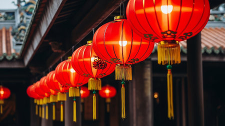 This stunning image captures vibrant red lanterns adorned with intricate details, creating a magical atmosphere perfect for festive celebrations, symbolizing joy and culture.