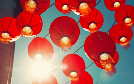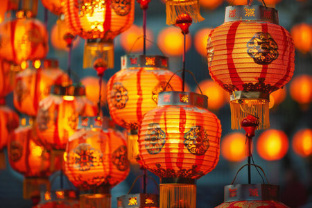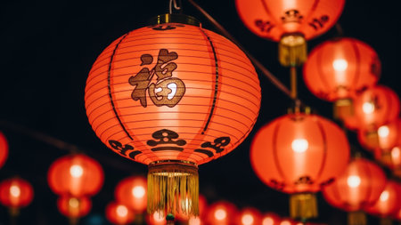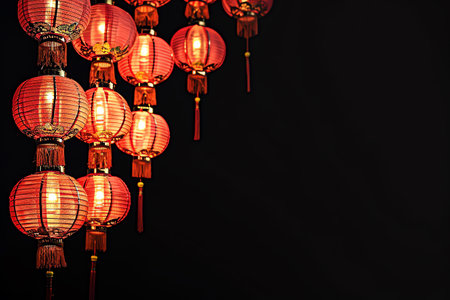 Vibrant red chinese lanterns glowing brightly against a dark, festive background, celebrating cultural traditions and holiday cheer