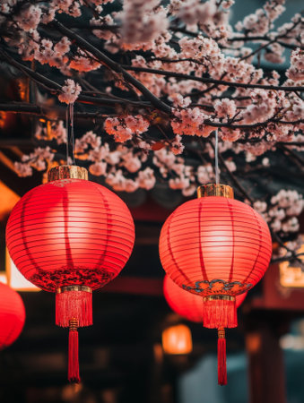 Red Chinese lanterns with tassels hanging beneath cherry blossom branches - ai