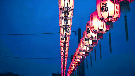 Chinese new year red lanterns glowing in the night. Chinatown streets decoration