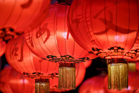 Group of red chinese lanterns illuminated at night for the chinese new year